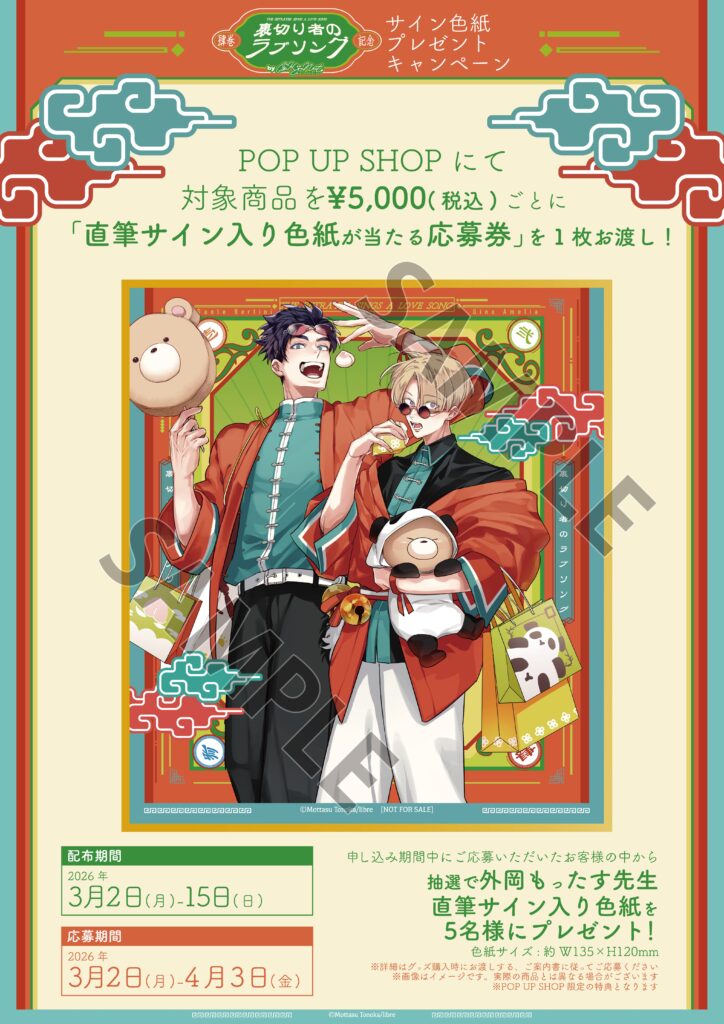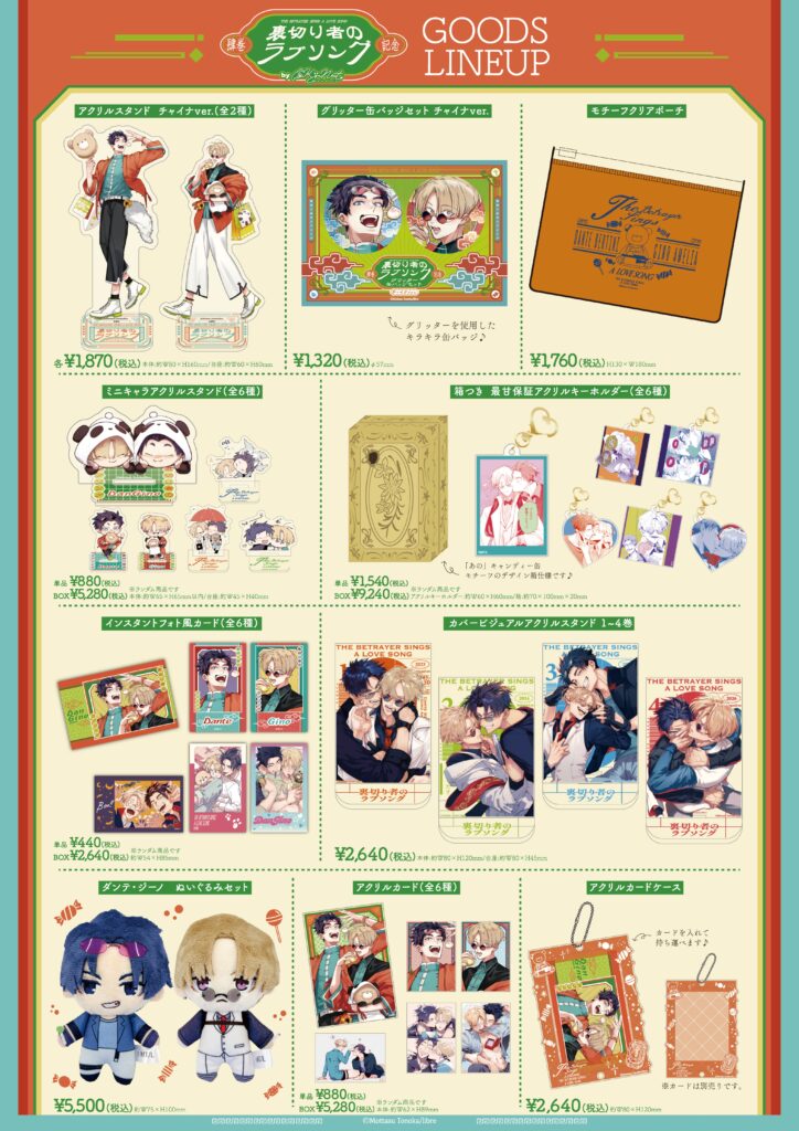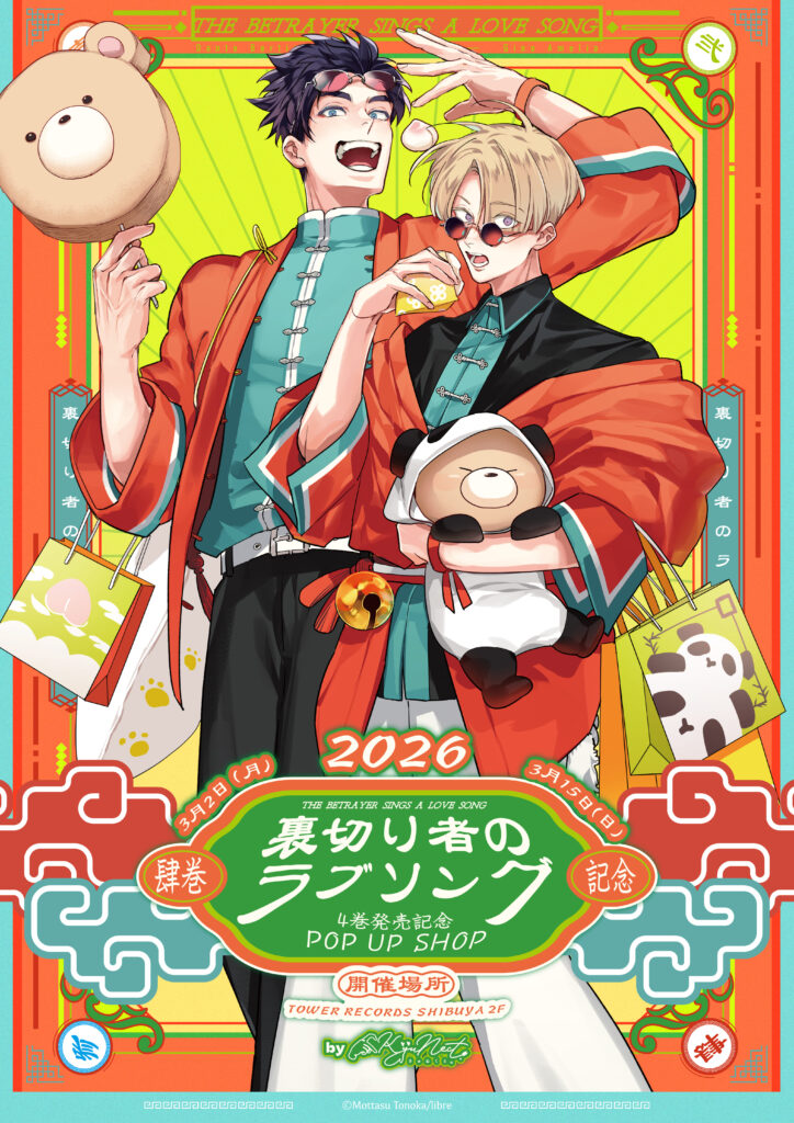 この度、裏切り者のラブソング4巻の発売を記念いたしまして、「裏切り者のラブソング4巻発売記念POP UP SHOP」の開催が決定いたしました!外岡もったす先生書き下ろしのチャイナ服に身を包んだダンテとジーノのグッズが買えるのはここだけ!✅皆様のご来場を心よりお持ちしております!💞