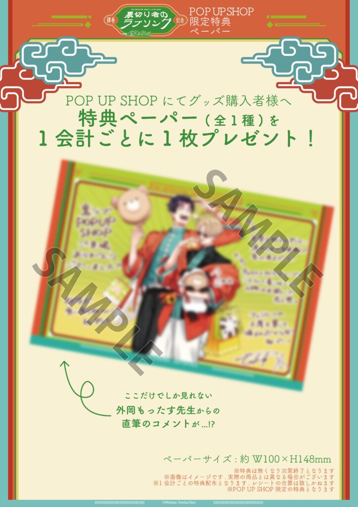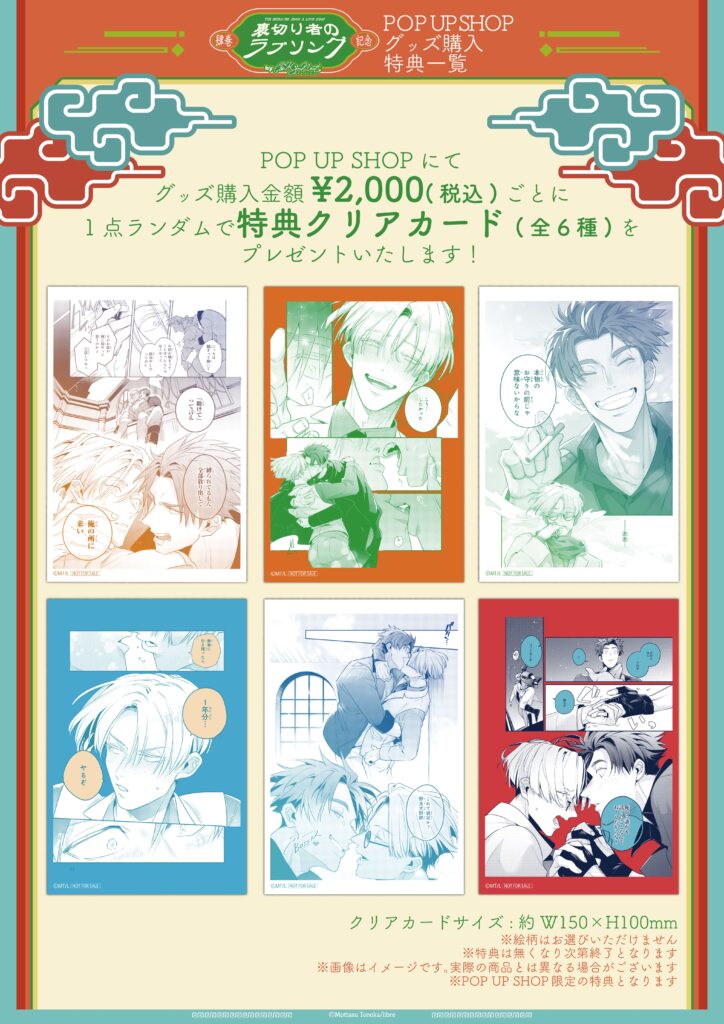 今回のPOP UP SHOPでは、グッズ購入金額2000円(税込)ごとに一点ランダムでクリアカードをお渡しいたします!名場面を色鮮やかにプリントした特製のクリアカードとなっております!さらに、グッズご購入者様へ一会計ごとにもったす先生のコメント入り特典ペーパーをプレゼント!💝ぜひ、ゲットしてください!