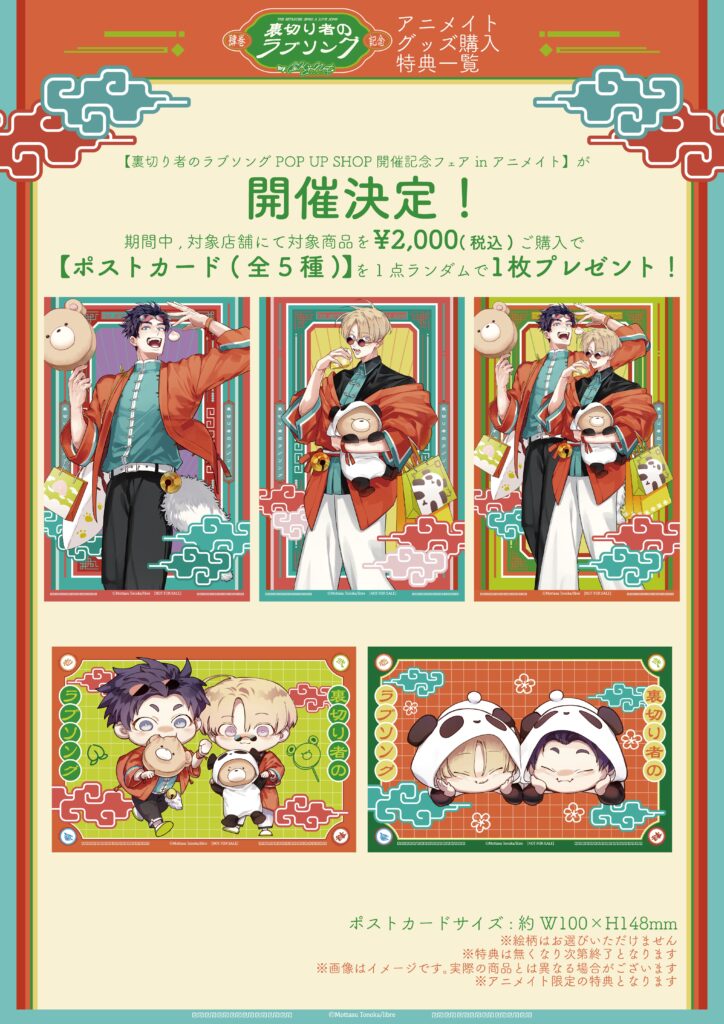 裏切り者のラブソング POP UP SHOP開催記念フェア in アニメイトの開催が決定いたしました!期間中、対象店舗にて対象商品を2000円(税込)ご購入の方にポストカード(全5種)をランダムで一枚プレゼントいたします!🎁この機会にぜひ、お近くのアニメイトにお立ち寄りください!