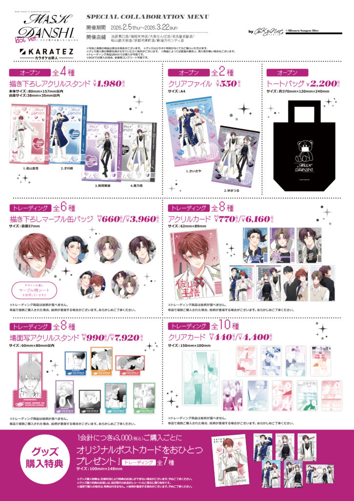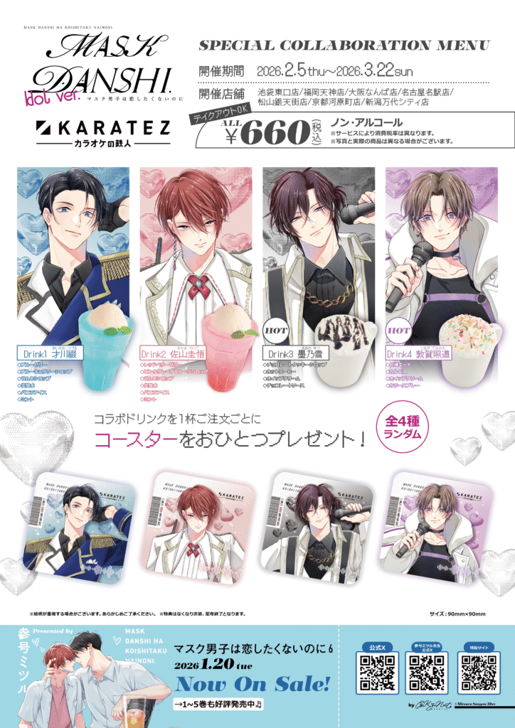 IPを活用した商品化/コラボイベントの企画運営及びグッズデザイン・グラフィック・イラスト制作を手がける株式会社ルフェイス(本社:東京都台東区、代表取締役:田中航太)とカラオケの鉄人(株式会社鉄人エンタープライズ、本社:東京都目黒区、代表取締役社長:兒玉 智之)は、この度、2026年2月5日(木)〜2026年3月22日(日)の期間、「マスク男子は恋したくないのに× カラオケの鉄人」を開催いたします。